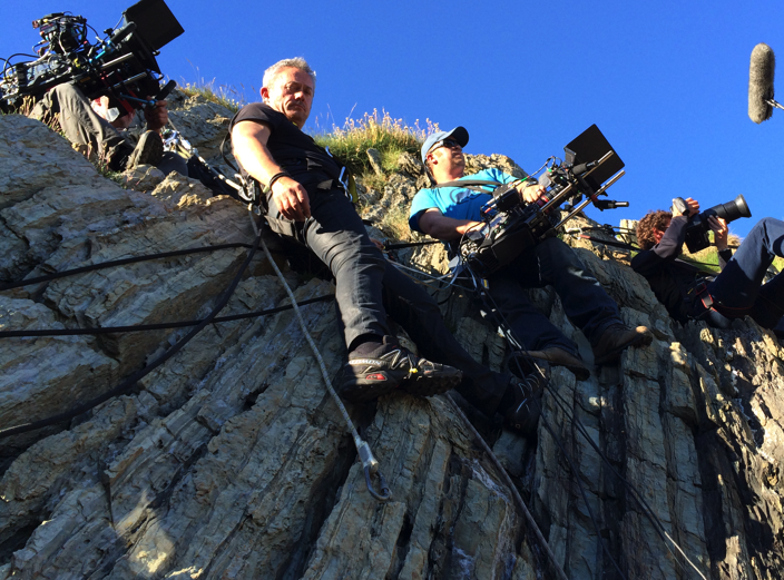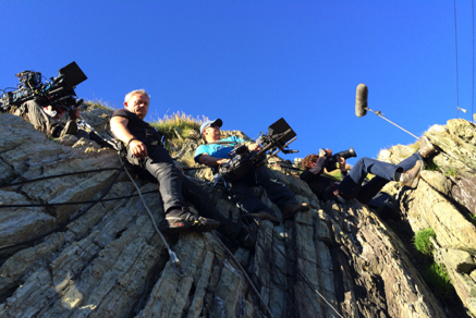 This is an example of our film set safety rigging for a camera crew harnessed into position filming on location off a precarious rocky cliff face.