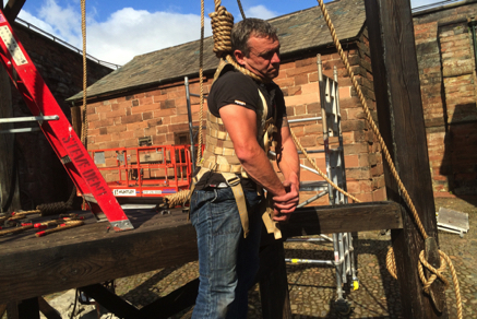 This shows the preparation of a gallows scene for an upcoming movie where an actor will be safely harnessed out in our safety rigging whilst maintaining a discreet profile for final costume fitting.
